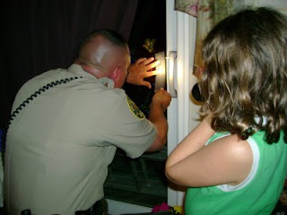 Anna Lynn, in tears, watches the patrolman take fingerprints.